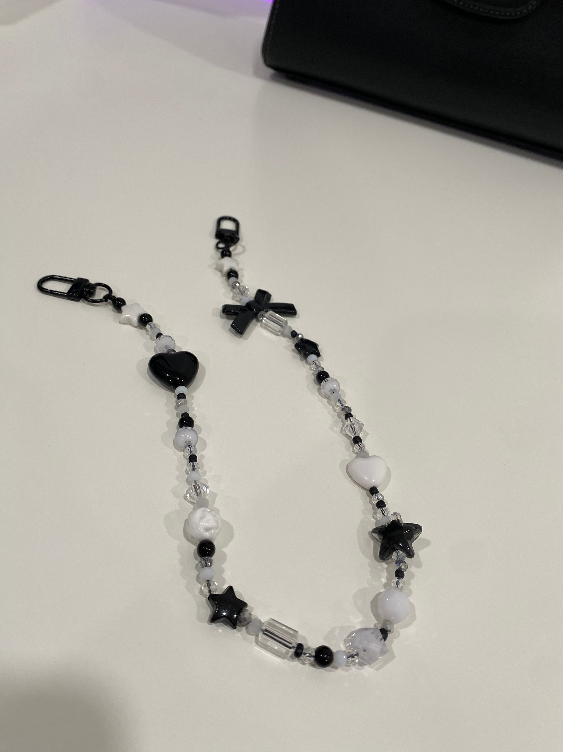 Add a bold, classic touch to your favorite handbag, backpack or tote with our handmade Black & White Beaded bag Charm. This chic accessory features a mix of black and white beads, shimmering crystal-style accents, and a sleek black clasp on each end for attachment. it’s perfect for draping across purse handles or adding a statement detail to your favorite bag. A versatile, timeless piece for anyone who loves stylish, monochrome accessories.