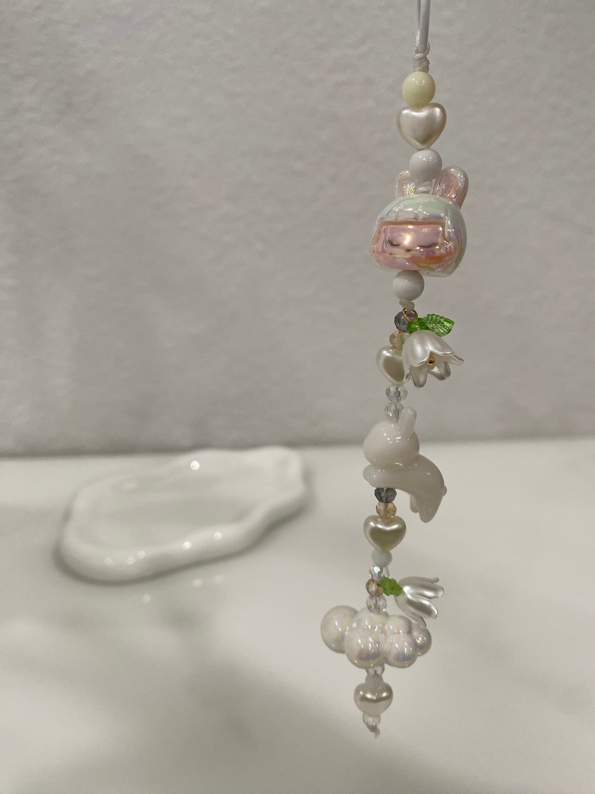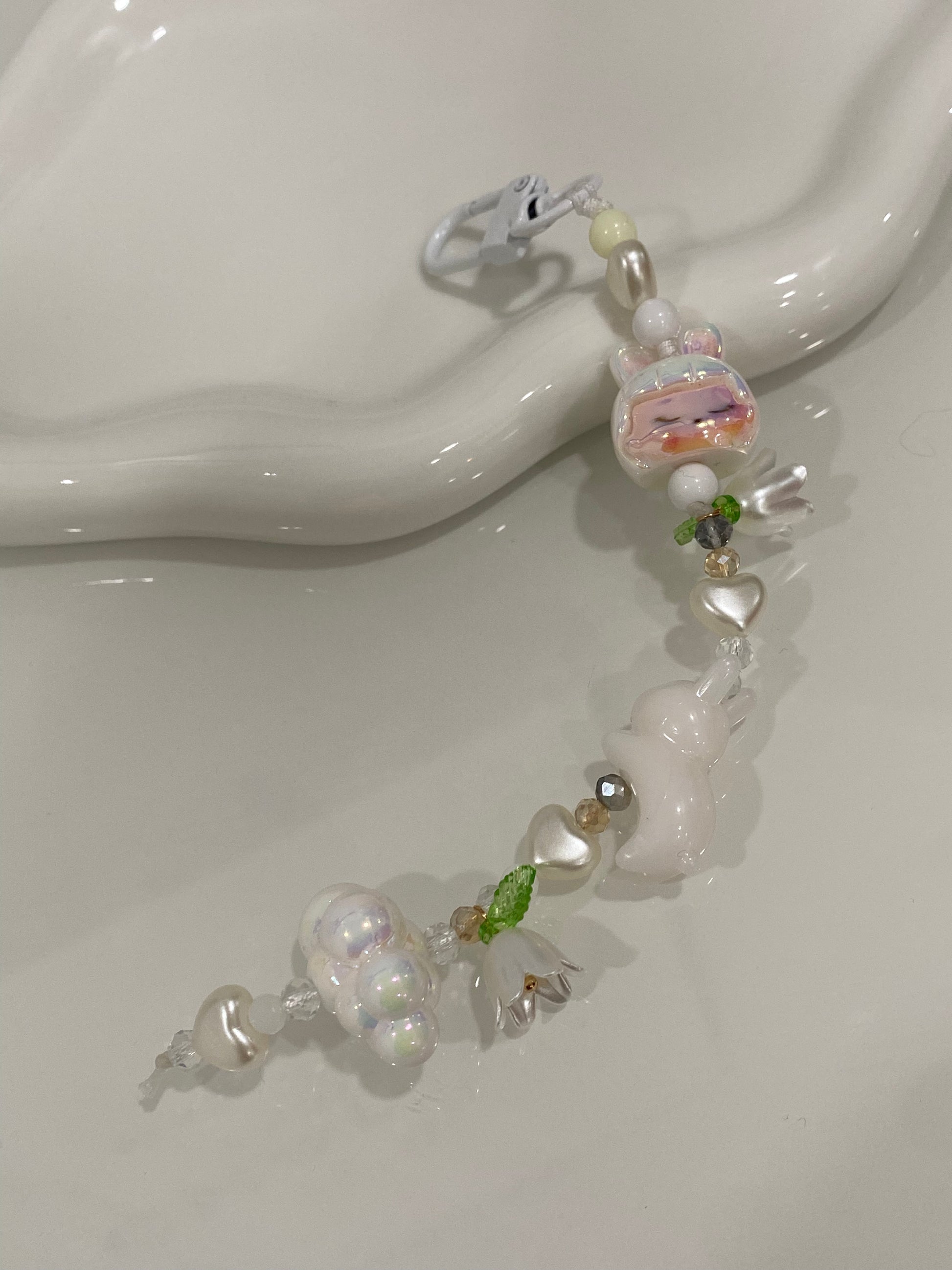- Materials: Acrylic bunny bead, acrylic crystal-style beads, imitation pearl beads, metal clasp
