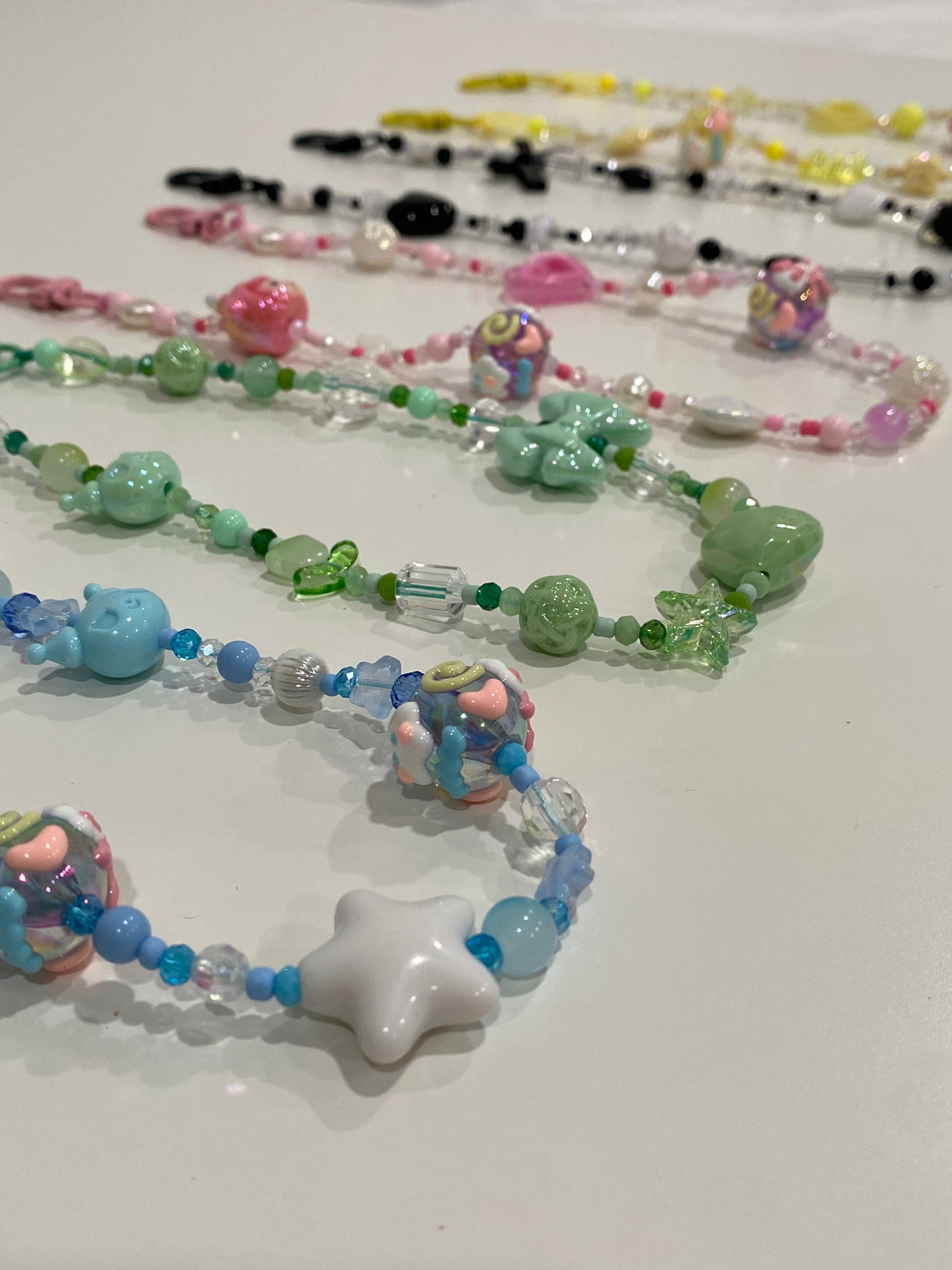 - Materials: Acrylic beads, acrylic crystal-style beads, large acrylic bow bead, metal clasps